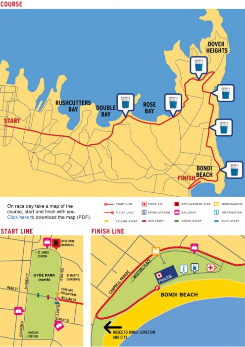 Voor de rest is het parcours echt prachtig. Het begint in Hyde Park (vlak aan de Saint Mary’s Cathedral, daar waar pope Benny de 16de onlangs nog heeft gewuifd met World Youth Day hier in Sydney). Een stuk wordt afgelegd in een tunnel, langs één van de sjiekste baaien met echte jachten, die debiele berg waar ik het al over had, en op het einde langs de Stille Oceaan tot aan het prachtige strand van Bondi. In één woord: vet!