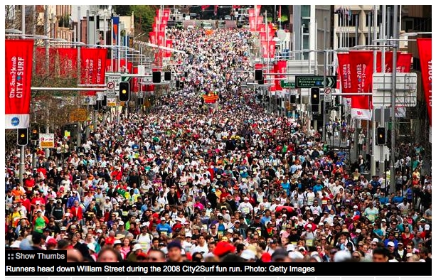 De City 2 Surf wordt telkens in augustus georganiseerd door de plaatselijke gazet. Het is zoiets om de winter gedag te zeggen en iedereen weer naar het strand te lokken. Ik snap het nut er niet echt van, aangezien gewoon iedereen heel de winter door al naar het strand gaat. Het is vergelijkbaar met de 20km door Brussel, maar dan in het groot. Het parcours gaat van het centrum tot aan het beroemde Bondi Beach.  En al de rest ertussen is behoorlijk heuvelachtig. Er is een stuk van 1.5 km stijgend aan een gemiddelde van 12%, die ze zeer idyllisch Heartbreak Hill noemen. Pijnlijk voor de kuitjes. In ieder geval een planneke hieronder voor de geïnteresseerden: