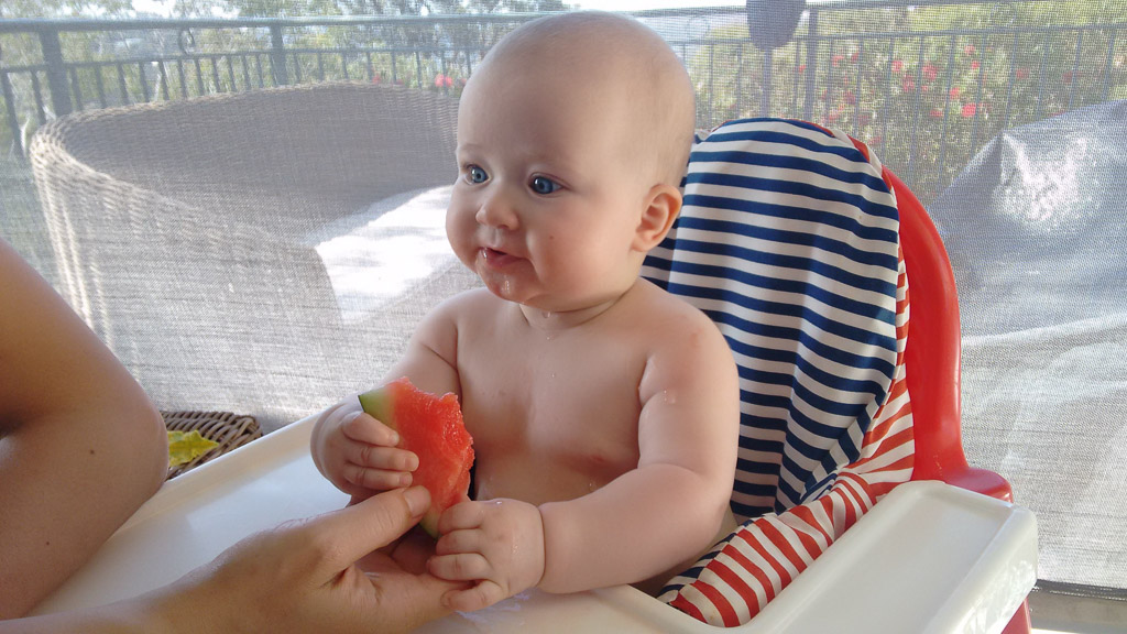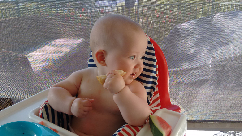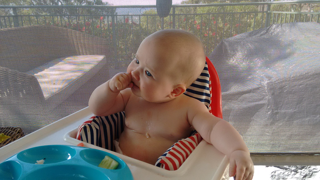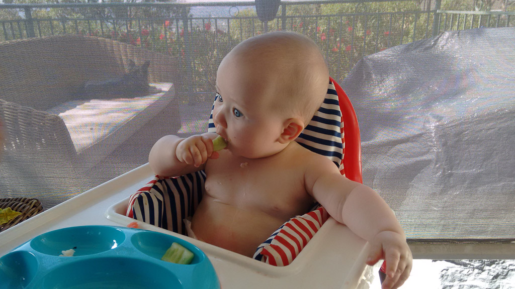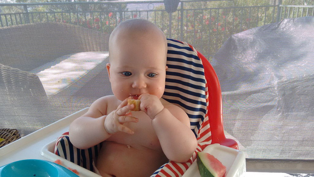Ze drinkt nog altijd moedermelk en pap. Maar bij de maaltijd is er ook water. Daar is ze zowiezo verzot op, maar een beetje extra op een warme dag kan geen kwaad ๐