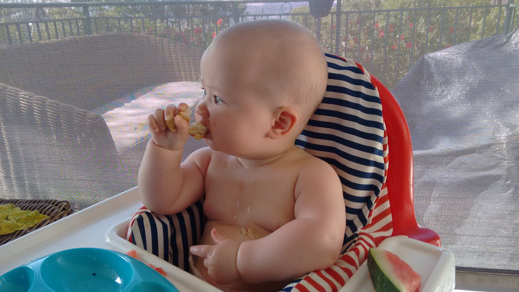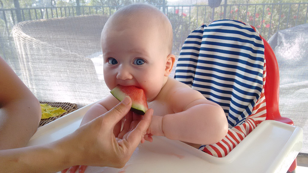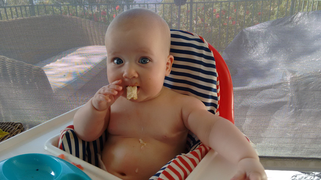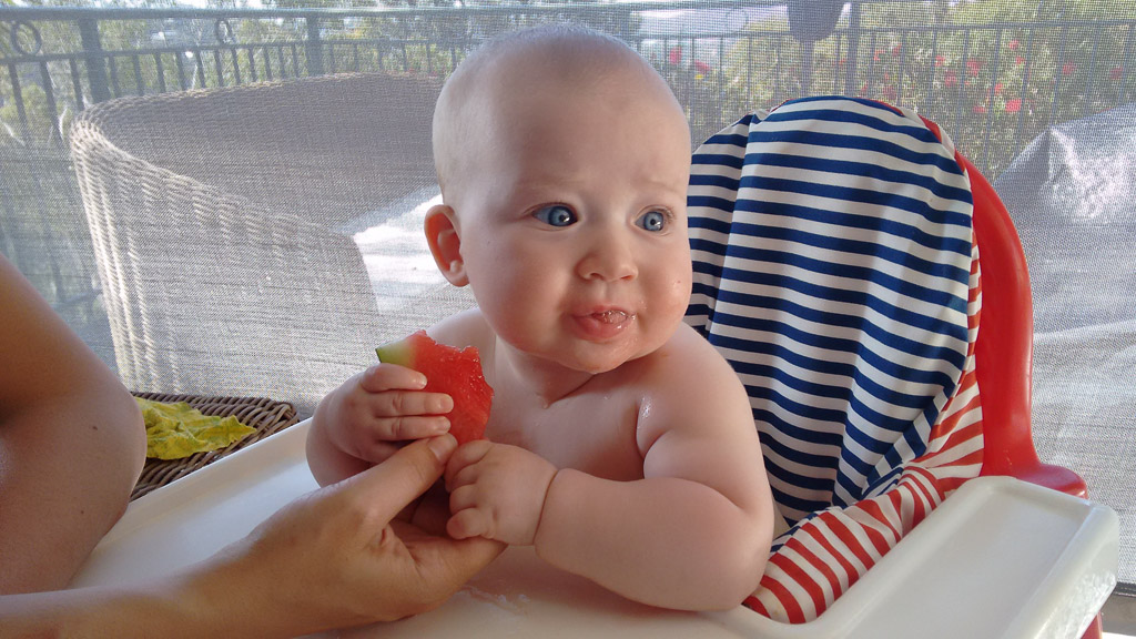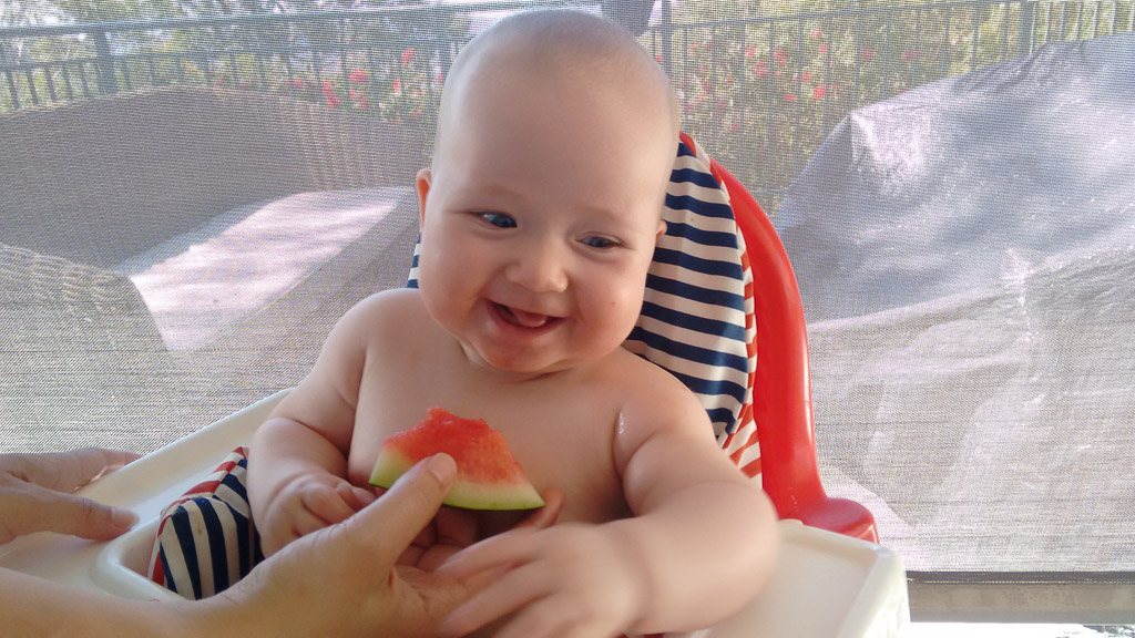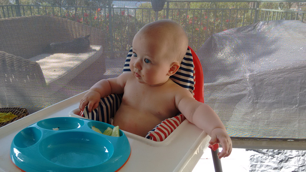 Ze drinkt nog altijd moedermelk en pap. Maar bij de maaltijd is er ook water. Daar is ze zowiezo verzot op, maar een beetje extra op een warme dag kan geen kwaad ๐