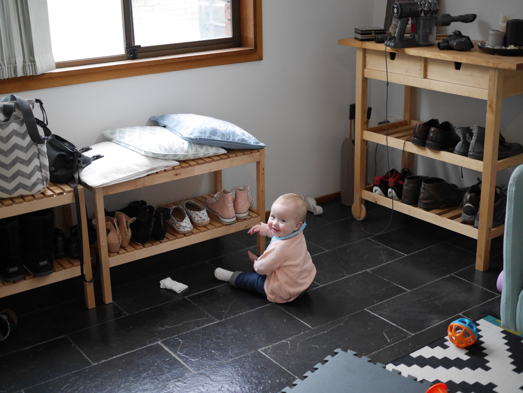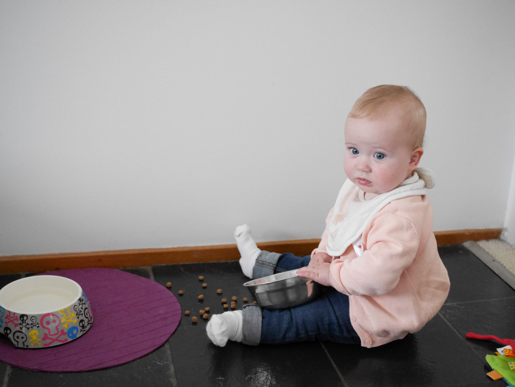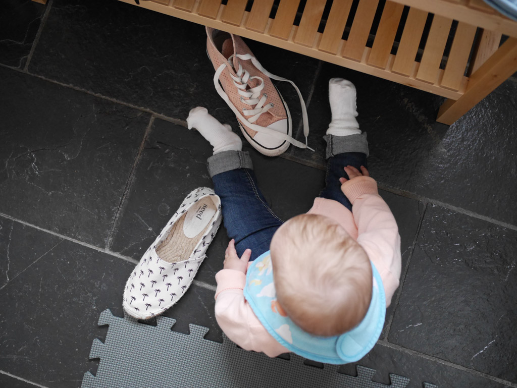 Charlotte heeft vandaag alle hoekjes van de keuken verkend. Het is weliswaar nog niet haar bedoeling – eerder een gevolg van zichzelf naar achter te duwen en op haar poep te gaan zitten (x 100). Maar uiteindelijk kwam ze knel te zitten aan het schoenenkastje. Joepie, veters!