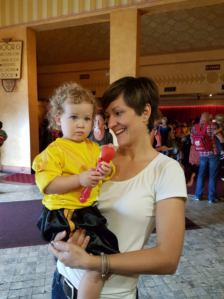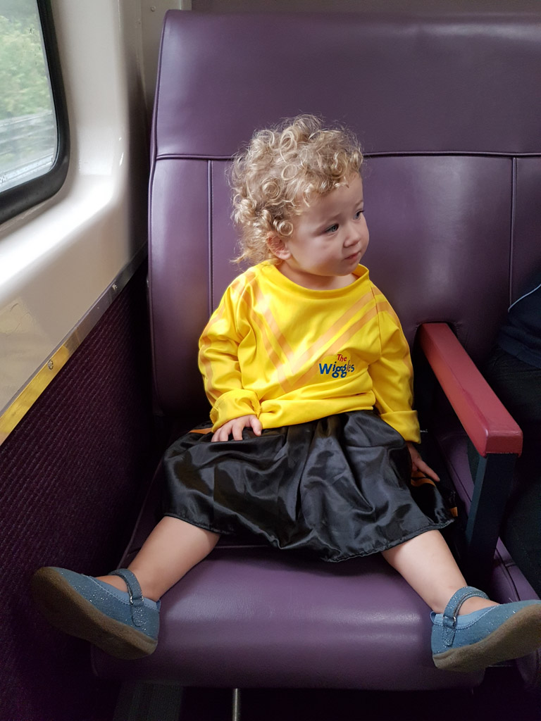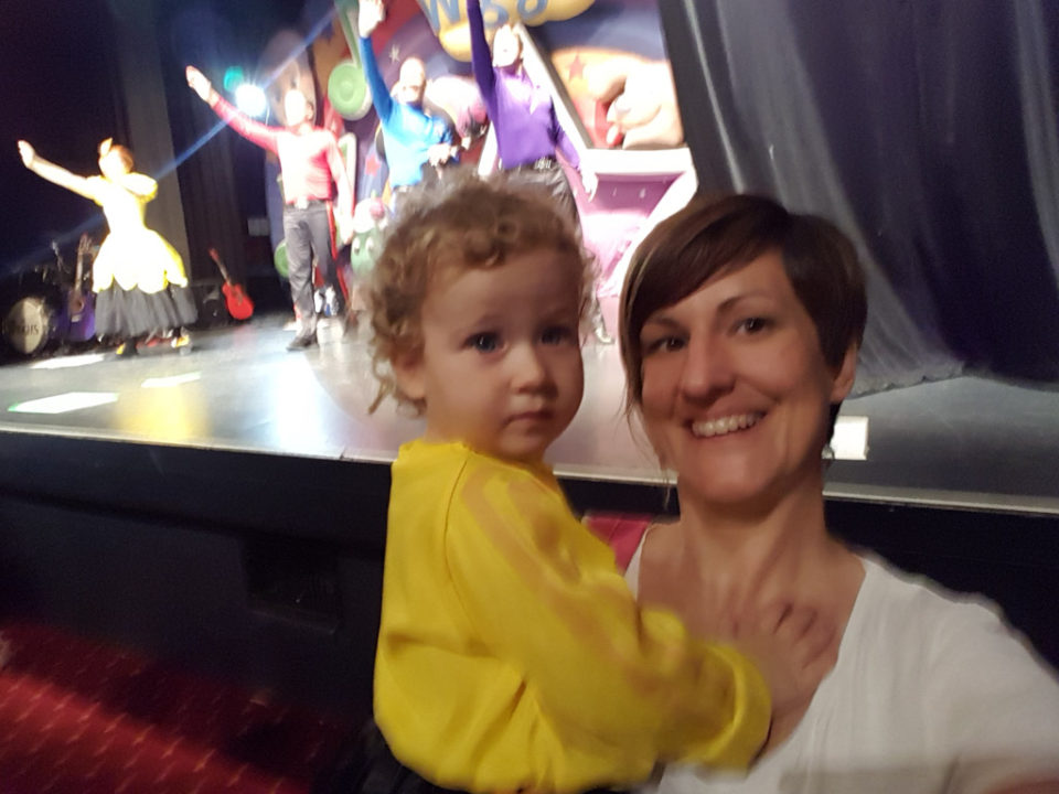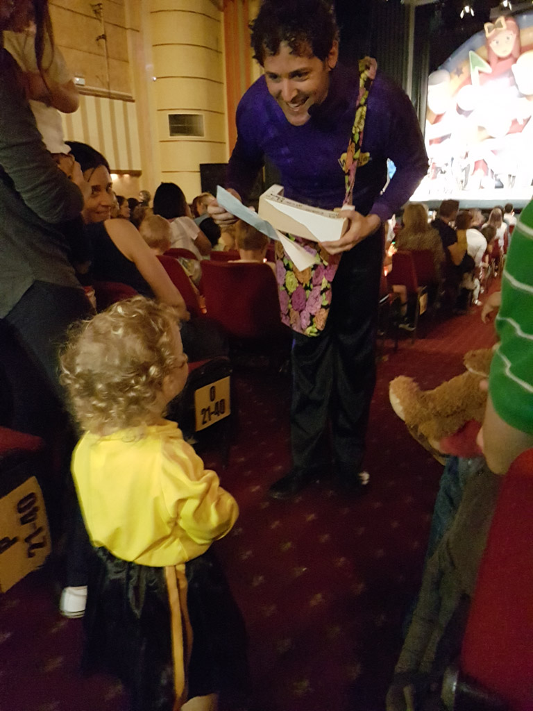 Tot nu toe heeft Charlotte de Wiggles enkel op scherm gezien. Maar vandaag zijn we heel vroeg opgestaan. En hebben toen de lange trip naar de grote stad gemaakt met de trein. Dat was op zich al dolle pret. Maar toen loodsde mama haar een donkere zaal binnen…ze vond het precies niet erg!