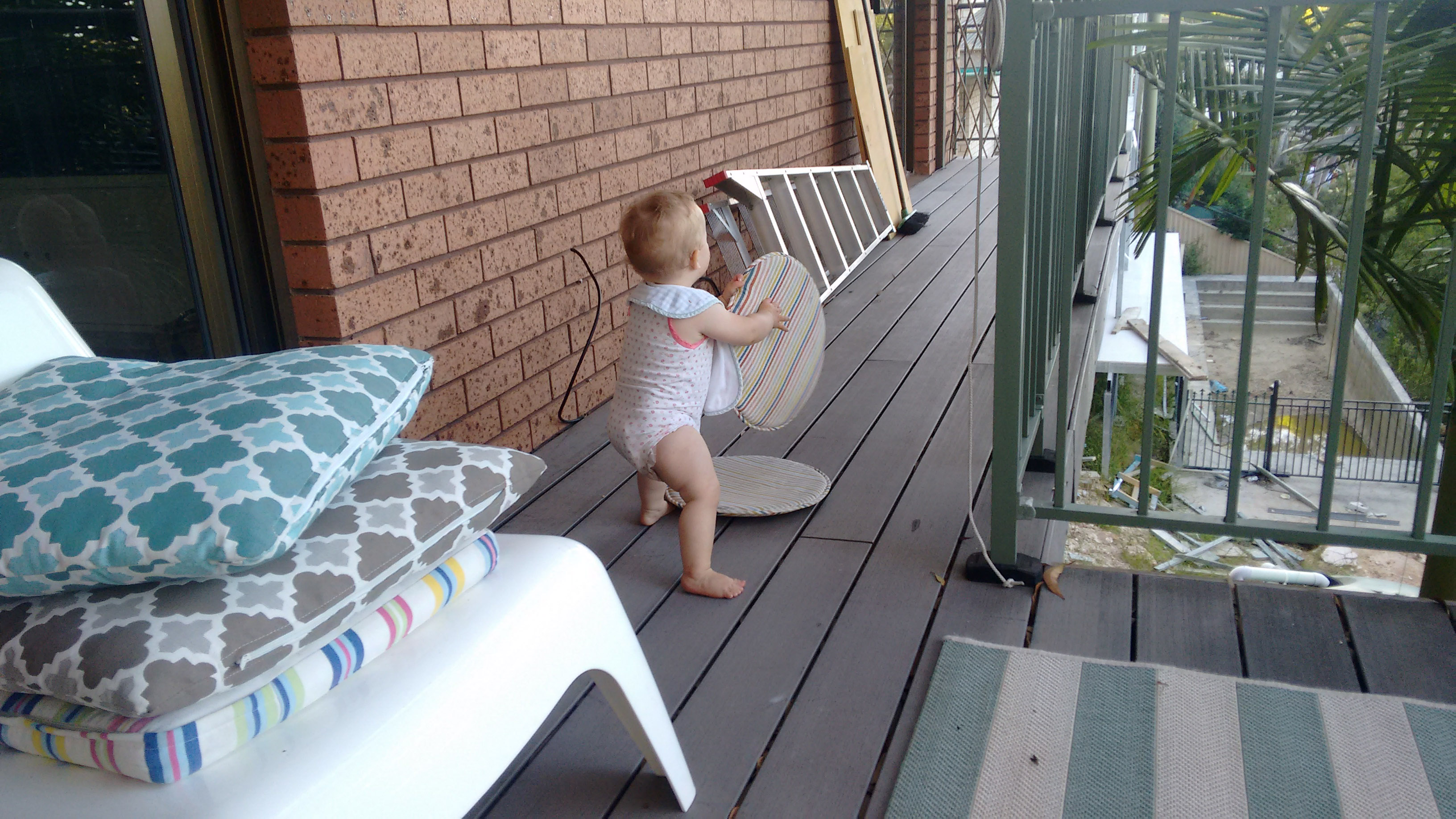 Het begon met zich een paar keer recht te trekken, en af en toe eens een handje los te laten. En dan twee handjes. En dan eventjes wiebelen. En maandag plots zag ik dat ze 2 keer vanuit hurk-stand helemaal rechtkwam – met haar benen nog heel wijd uit elkaar, een beetje als een sumo-worstelaar. Ik had jammer genoeg de tijd niet om een foto te nemen, want ze viel elke keer meteen op haar poep. Allez hop, dacht ik, dan misschien toch nog wat stapjes voor haar verjaardag.