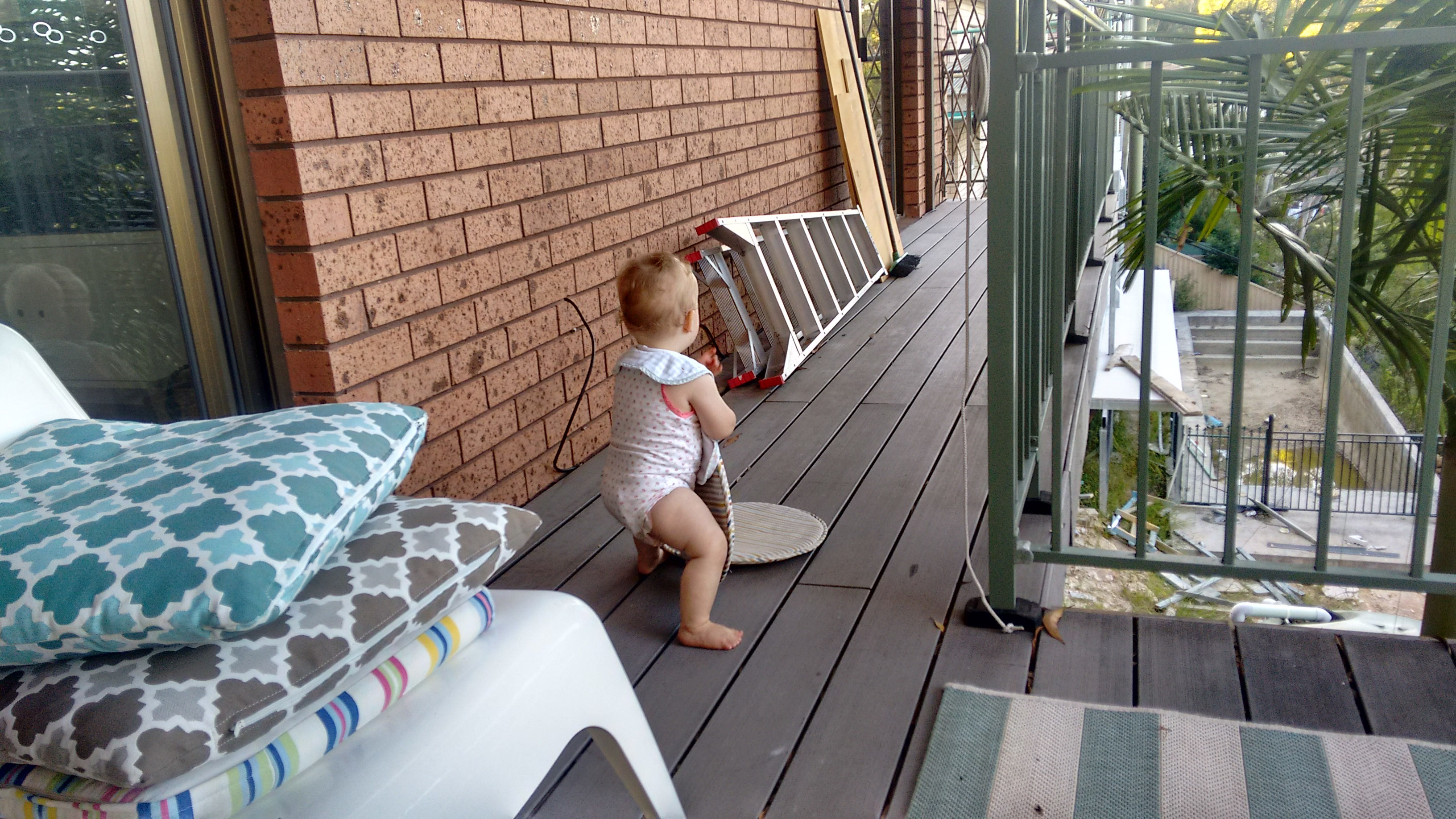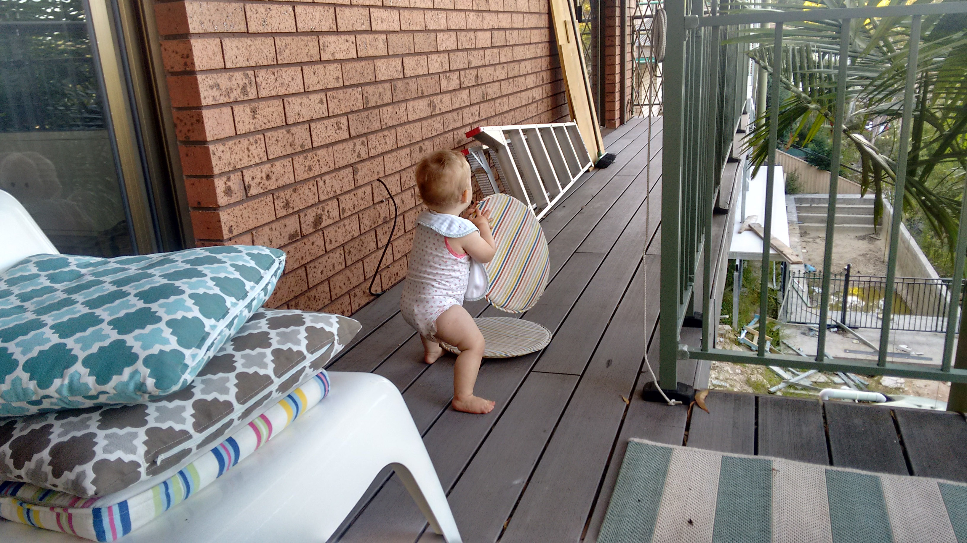 En en en en en en en…we hebben het niet op film, maar na haar badje was ze weer aan het oefenen. En toen heeft ze zelfs een stapje richting papa (en haar bal) gezet! Ze viel wel meteen daarna op haar knietjes. Maar dus…telt dat dan als een stapje?