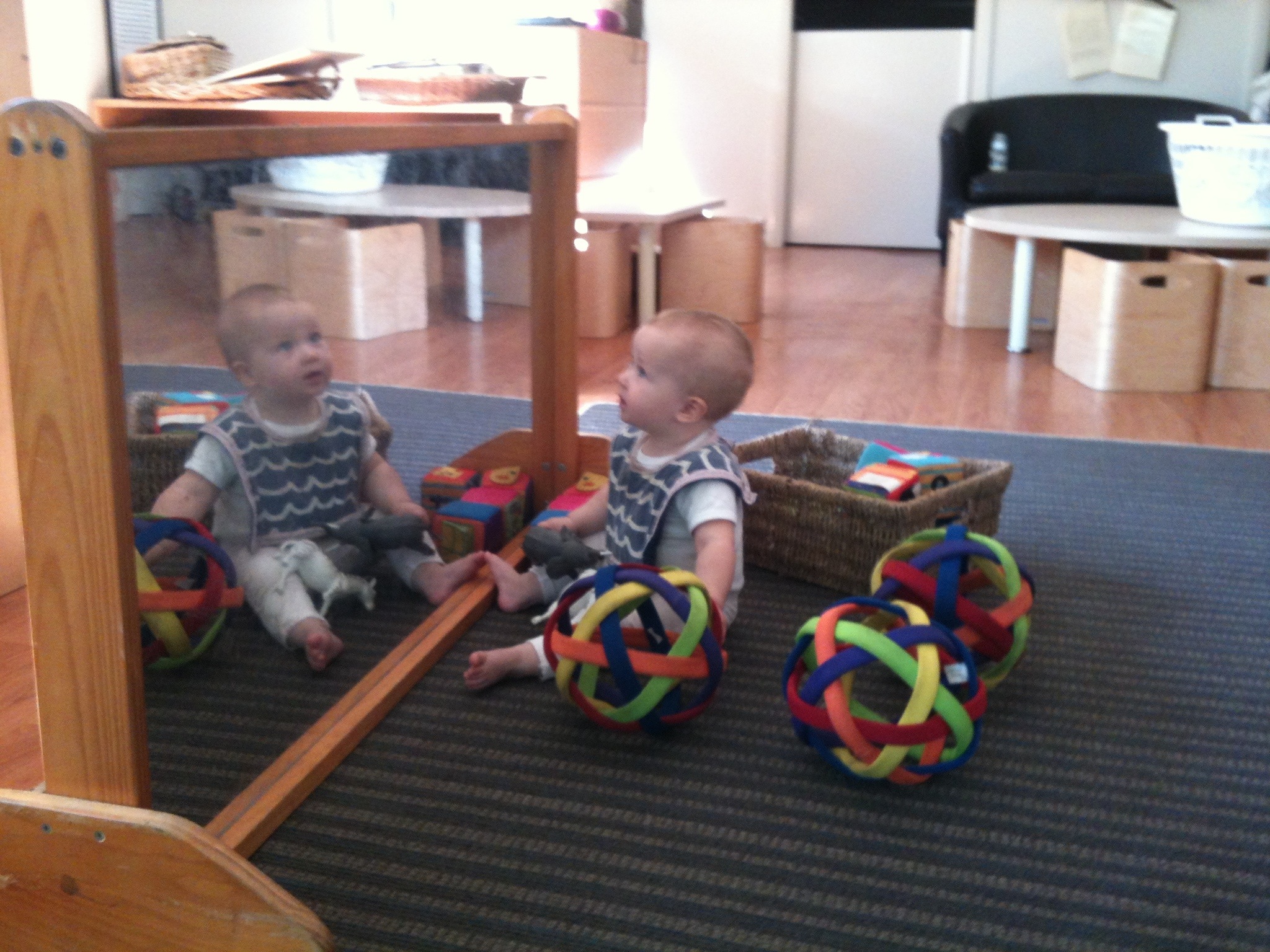 Dus ik met Charlotte en een klein hartje naar daar. Ik was meteen na haar ochtendslaapje (half 10 ‘s morgens) vertrokken, zodat ik haar ter plekke nog een flesje kon geven. Het eerste wat we zagen toen we arriveerden, waren alweer 2 ontroostbare babietjes. Gigi (Jaime), waar we al een aantal keer mee samen gespeeld hebben (haar ouders zijn ook fotografen). Het was Gigi’s 4e dag, maar ze was er nog altijd niet goed van. En dan Jess, zo oud als Charlotte, haar 1e dag, en die wou niet gaan slapen. Dus ik zet Charlie neer op de speelmat, tussen al dat gebleit, en ons mevrouwtje gaat gewoon vrolijk spelen. Kruipt naar de spiegel en begint naar zichzelf te lachen 🙂 “Amai die is hier op haar gemak” zei Lee, een van haar verzorgsters. Toen zei Miss Janne (de hoofdverzorgster) “Ja, zoals haar wil ik er wel 20”. Tijdens het flesje pakte ze me wel vast. Maar daarna ging ze vrolijk verder spelen. Keek zelfs niet op of om toen ik ‘dada’ zei!