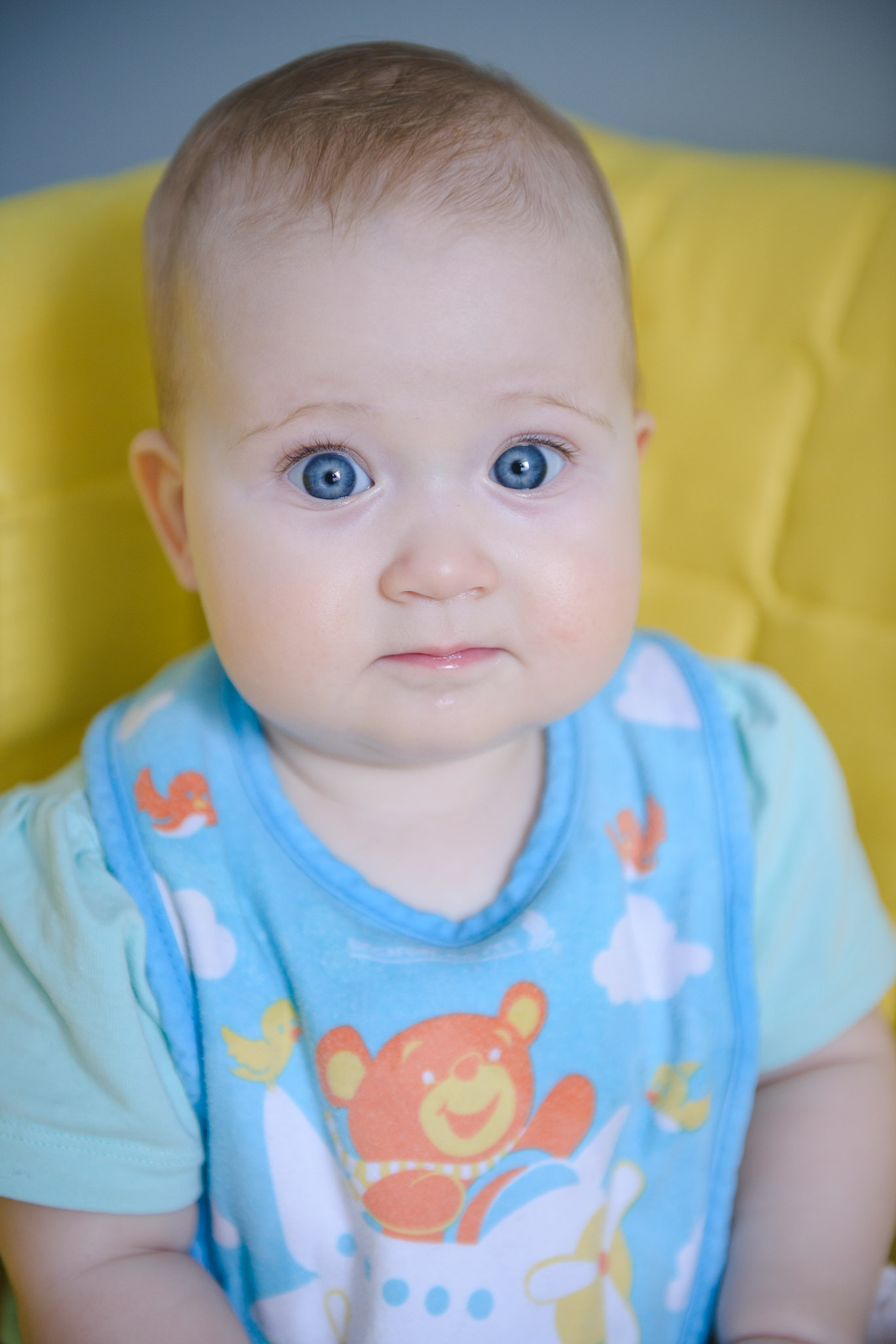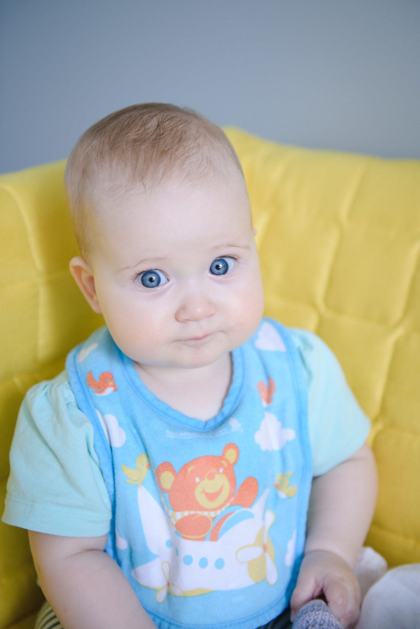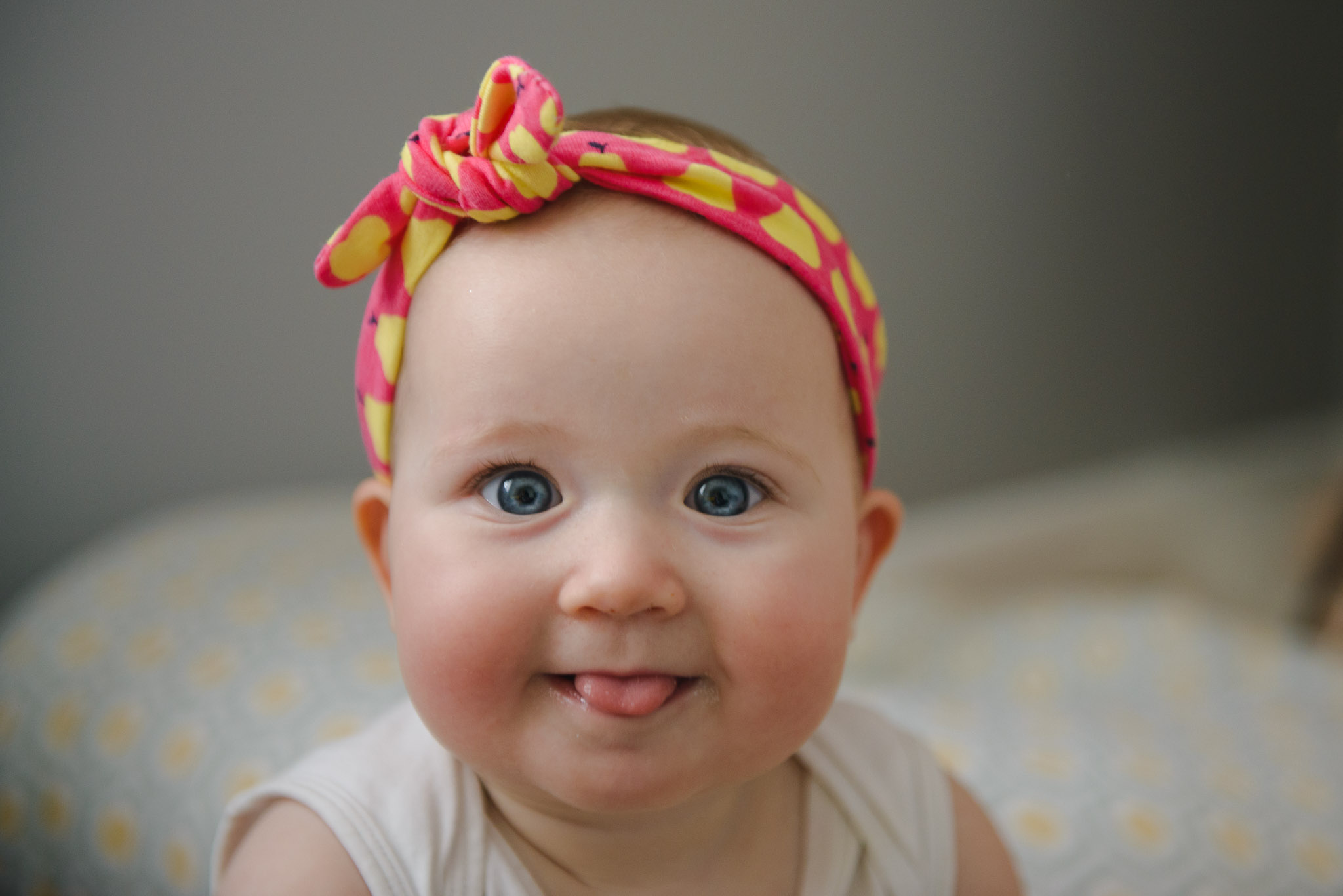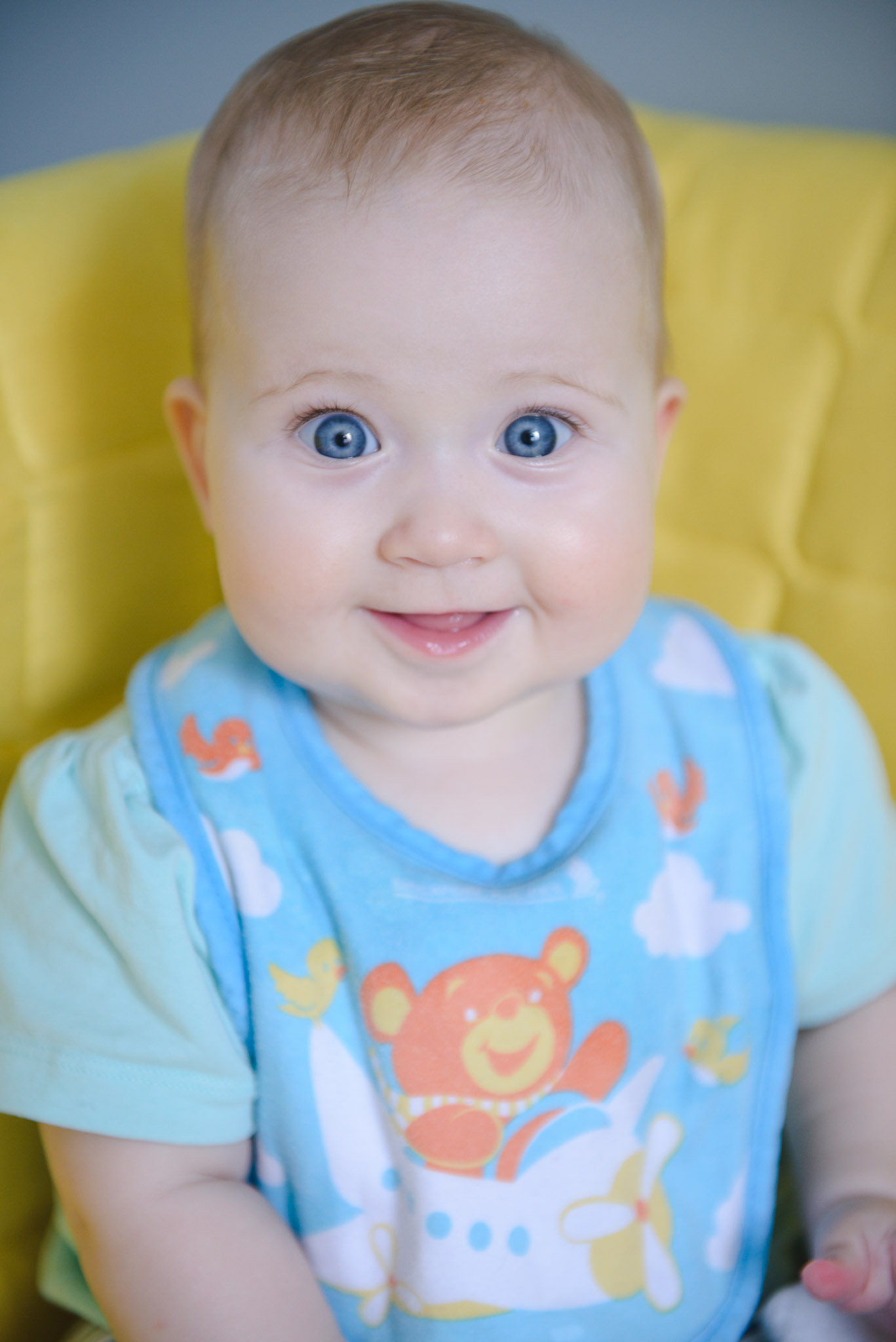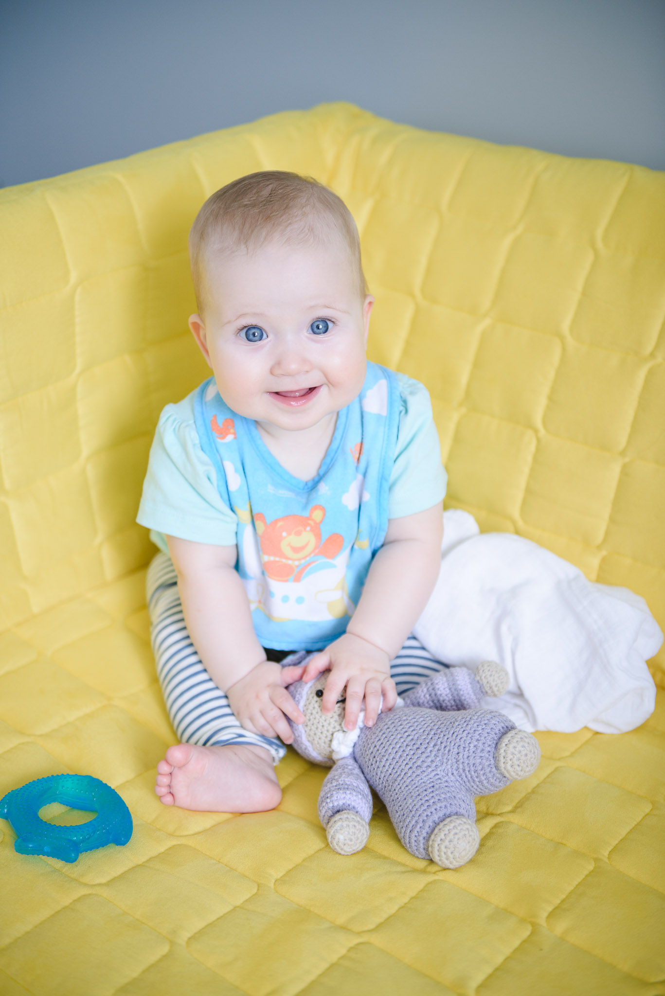 Haar favoriete bezigheid is nu iets vastpakken met duim en rest van haar hand. Van hele grote stukken watermeloen tot piepkleine miertjes. Alles heeft ze gezien. Raar maar waar, ze is niet zo zot van ‘kiekeboe’ spelletjes. Andere kindjes van haar leeftijd vinden dit hilarisch, maar zij kijkt gewoon serieus verder. Ze vind het wel heel leuk om met haar speelgoed (en bestek) op tafel te slaan. Ook als we zingen en in de handen klappen. Haar speelmat is getransformeerd in een ‘activity’ table, daar kan ze lekker met vanalles op slaan, eraan prutsen, dingen laten vallen en alles in haar mond steken.