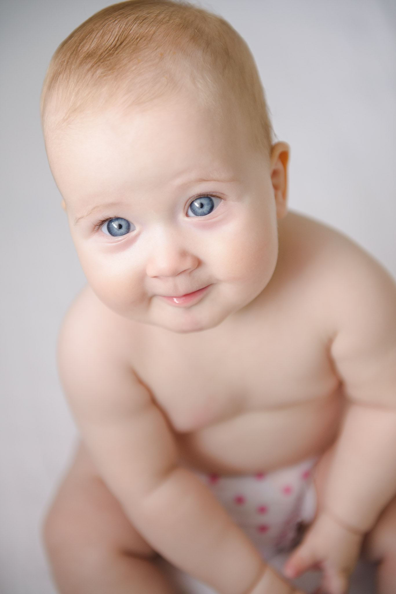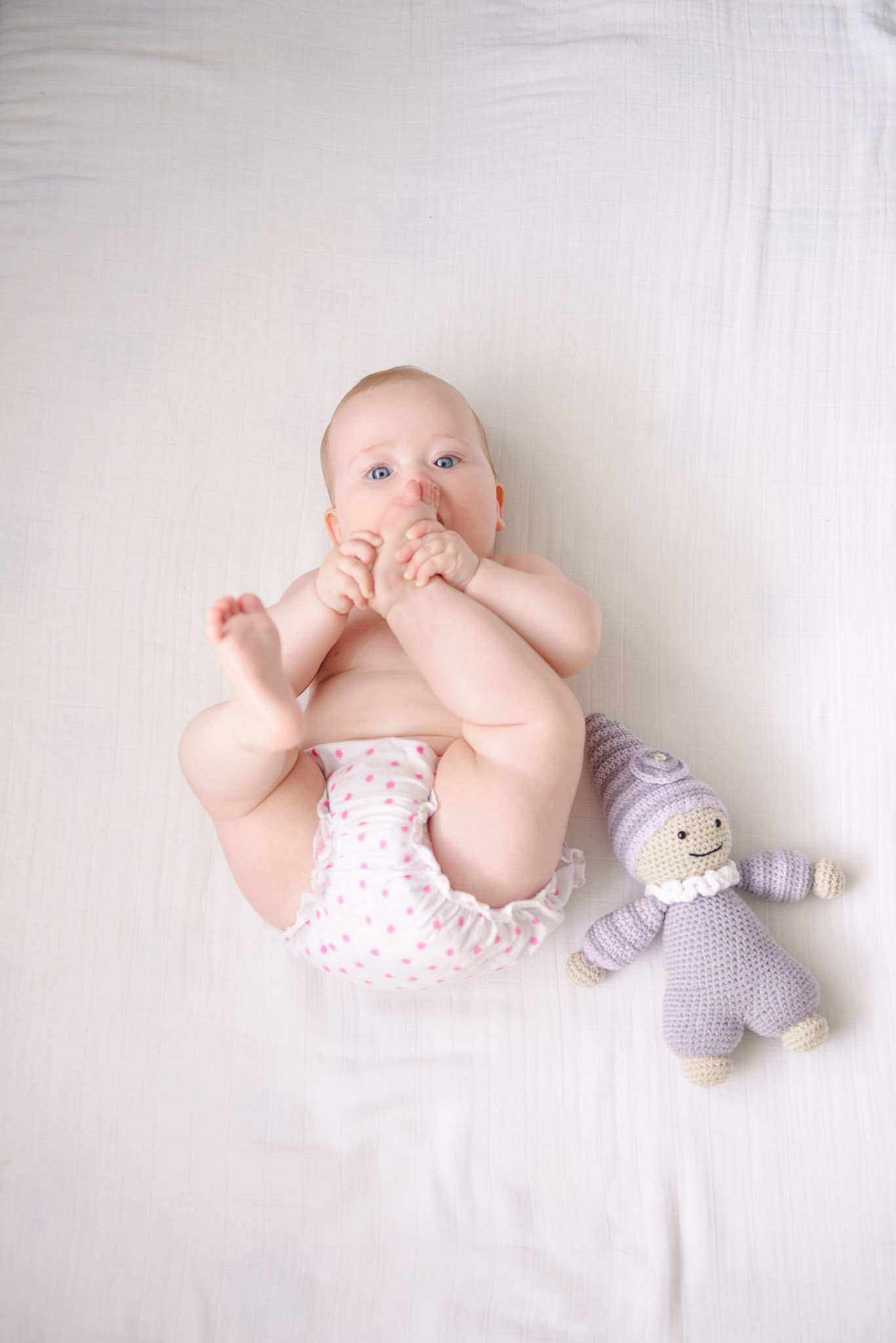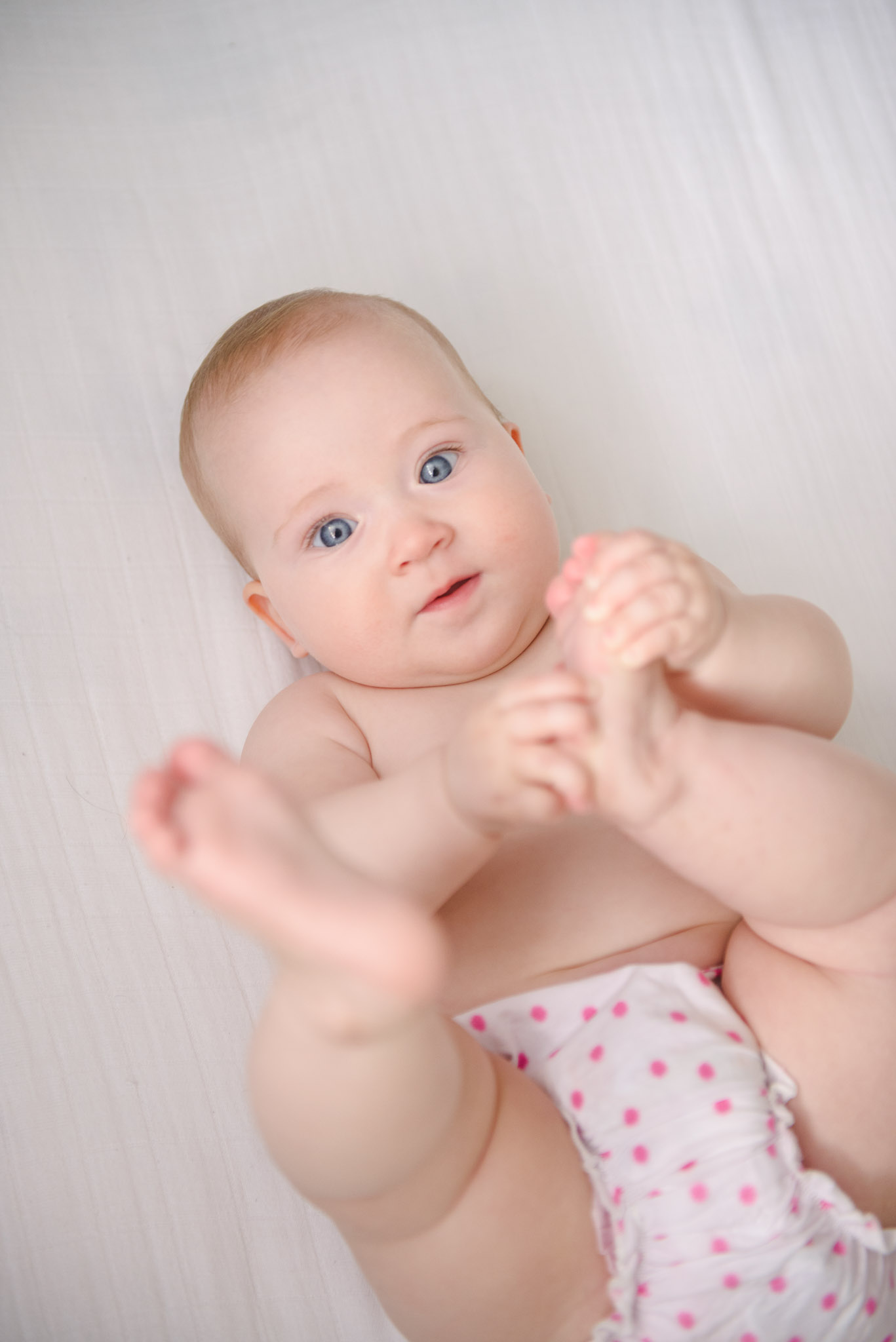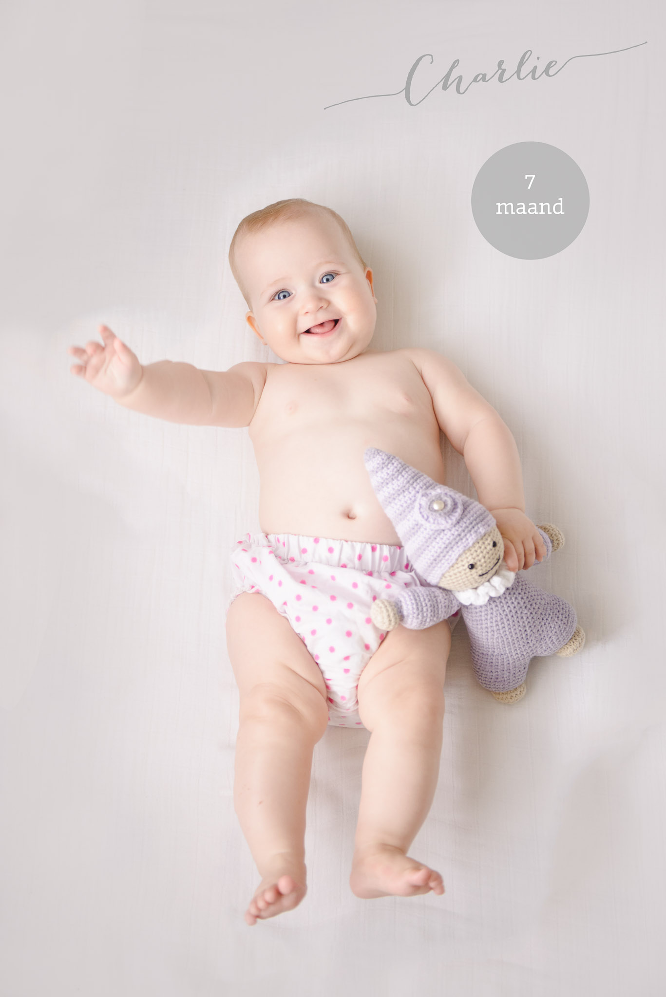 Deze maand heeft Charlie geleerd om zelf te rollen en kan ook al blijven zitten – al kan ze zich net nog niet zelf in deze houding optrekken (maar probeert wel hoor ;-)). Ze kruipt nog niet, maar zet zich wel af met haar voetjes als wij daar iets tegenhouden. Ze kan ook al op de zetel leunen en zo op haar benen blijven staan!