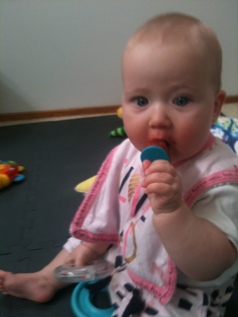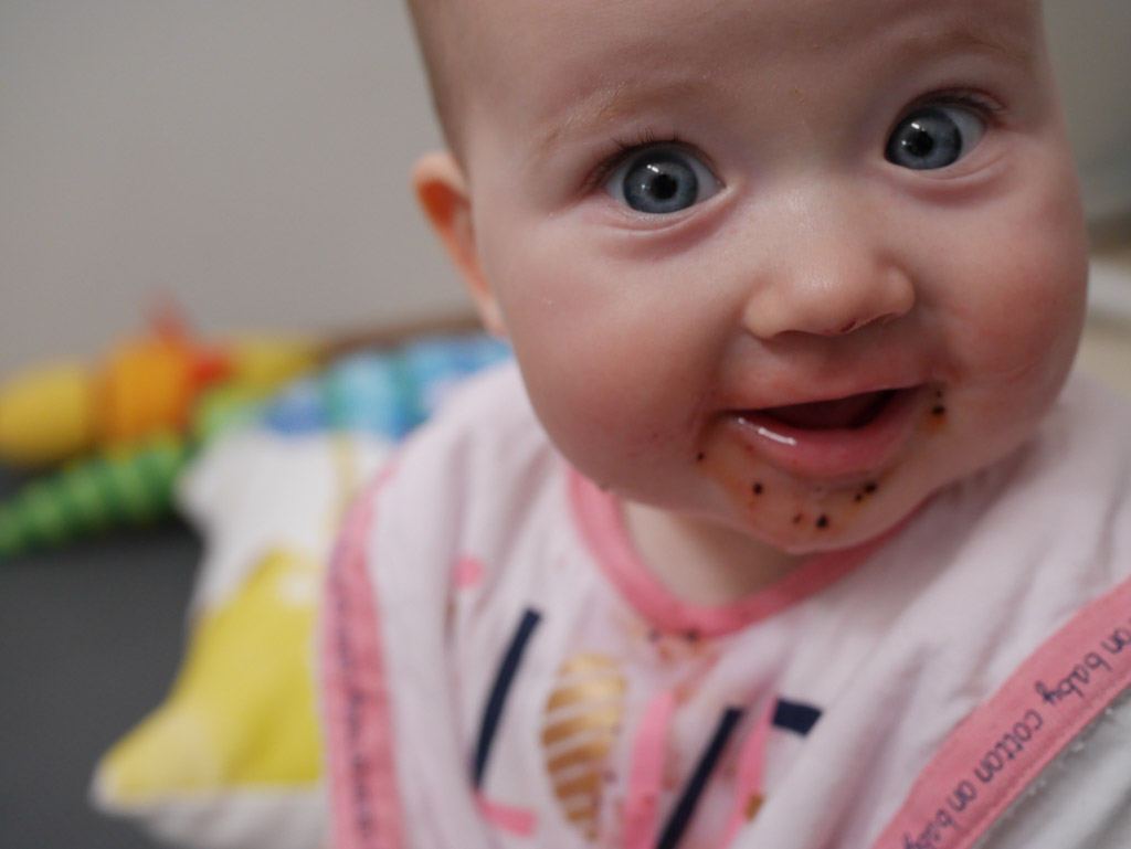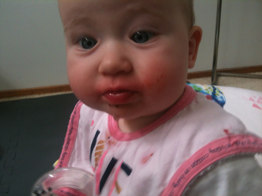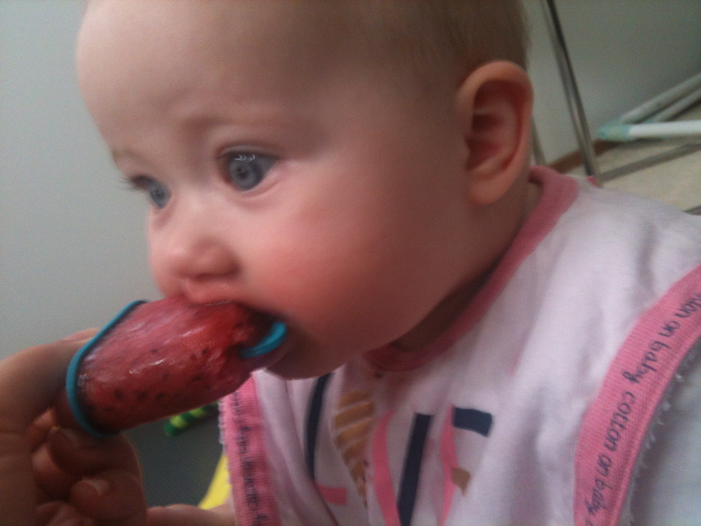Zelfgemaakt. Wist niet zeker of ze het ging lusten… Er zit aardbei in, kiwi, beetje bosbes, beetje fruitsap en water. Geen suiker dus! Maar na het eerste aarzelende lekje volgde er nog eentje… en al snel werd er duchtig gesmakt!!!