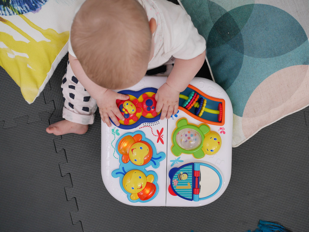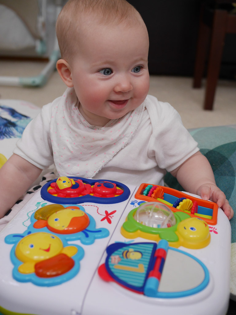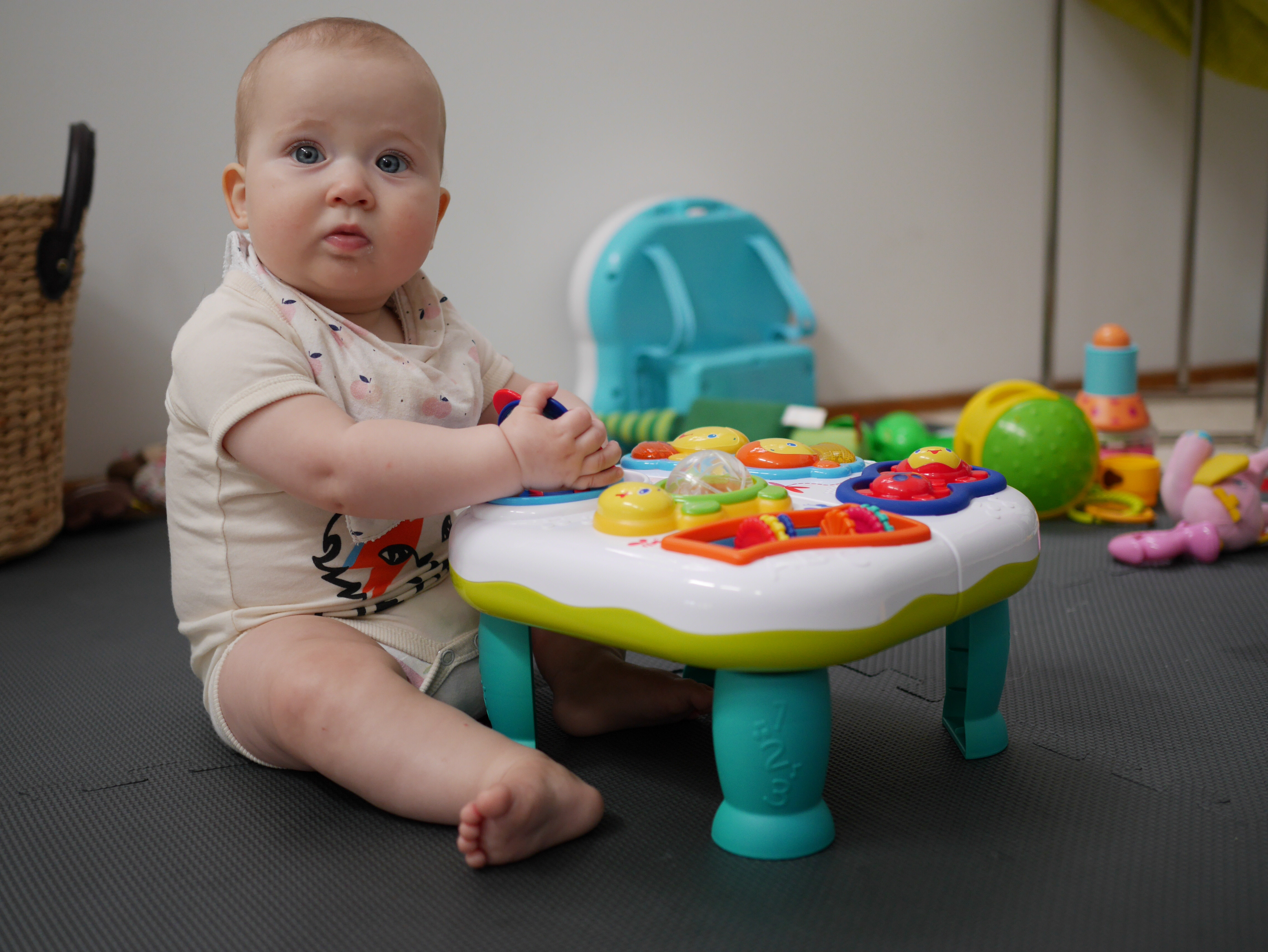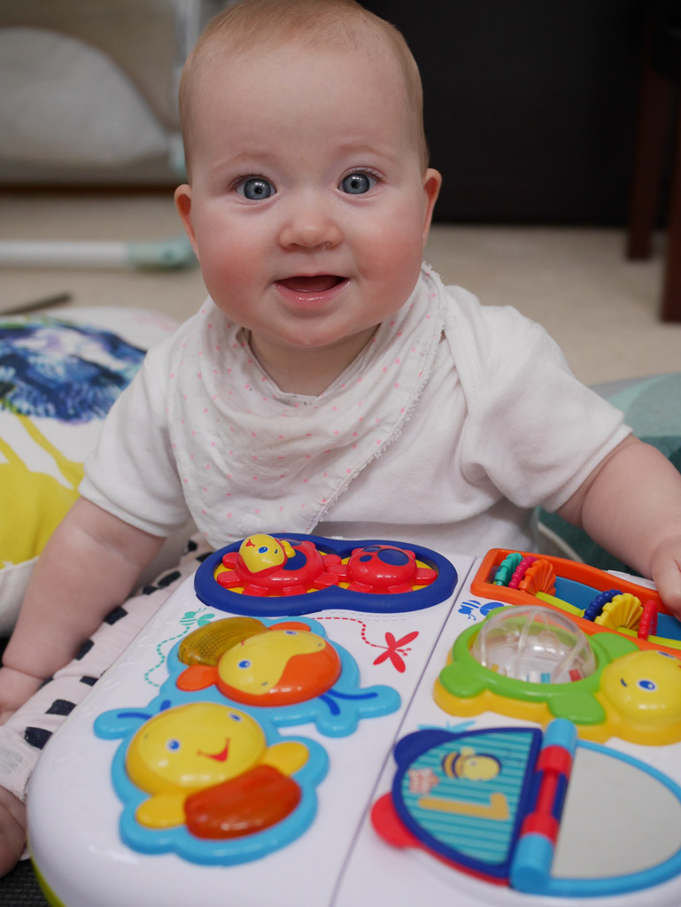 Toen we terugkwamen van Bali, hebben we de playgym (boven de speelmat) maar afgebroken. Charlotte had het bijna zelf al gedaan 😉 De stukjes passen in elkaar en maken zo een tafeltje. Dat was meteen goedgekeurd!!!