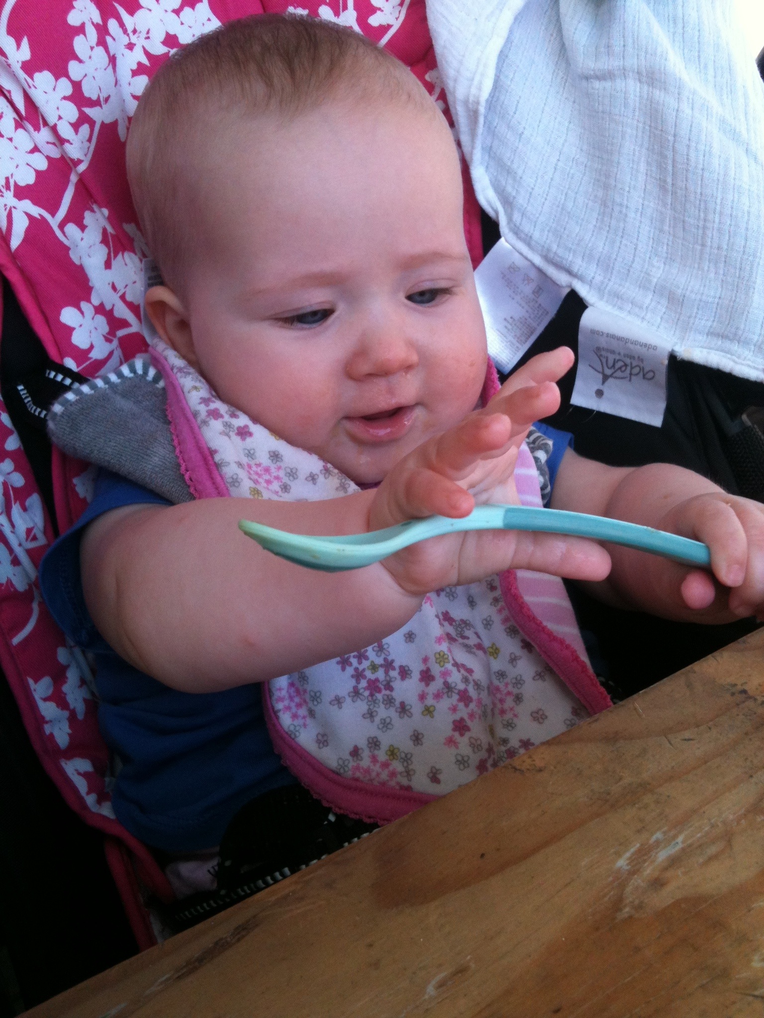 Ik heb nog een beetje een snotneuzeke, dus ben ik met mama en papa gaan ontbijten ipv te gaan zwemmen. Ook leuk! Ik ben al zo groot dat ik mee aan tafel mag. En met mijn lepeltje katapulteer ik papa vol pap, hihihi 😈