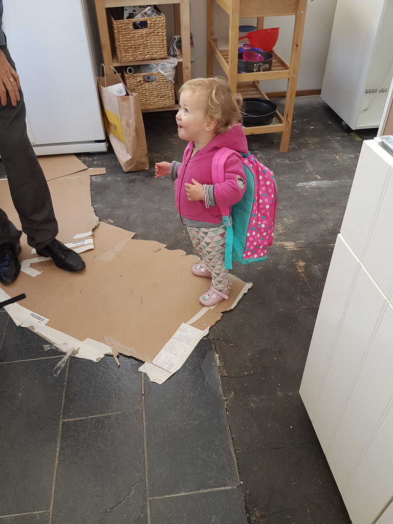 Haar hoedje steek ik altijd in het voorste zakje. Dus wanneer Charlotte de keuken binnenkomt, gaat ze altijd eerst naar haar rugzak, en dan moet het hoedje eruit (en op haar hoofd). (zo’n 20 keer per dag).