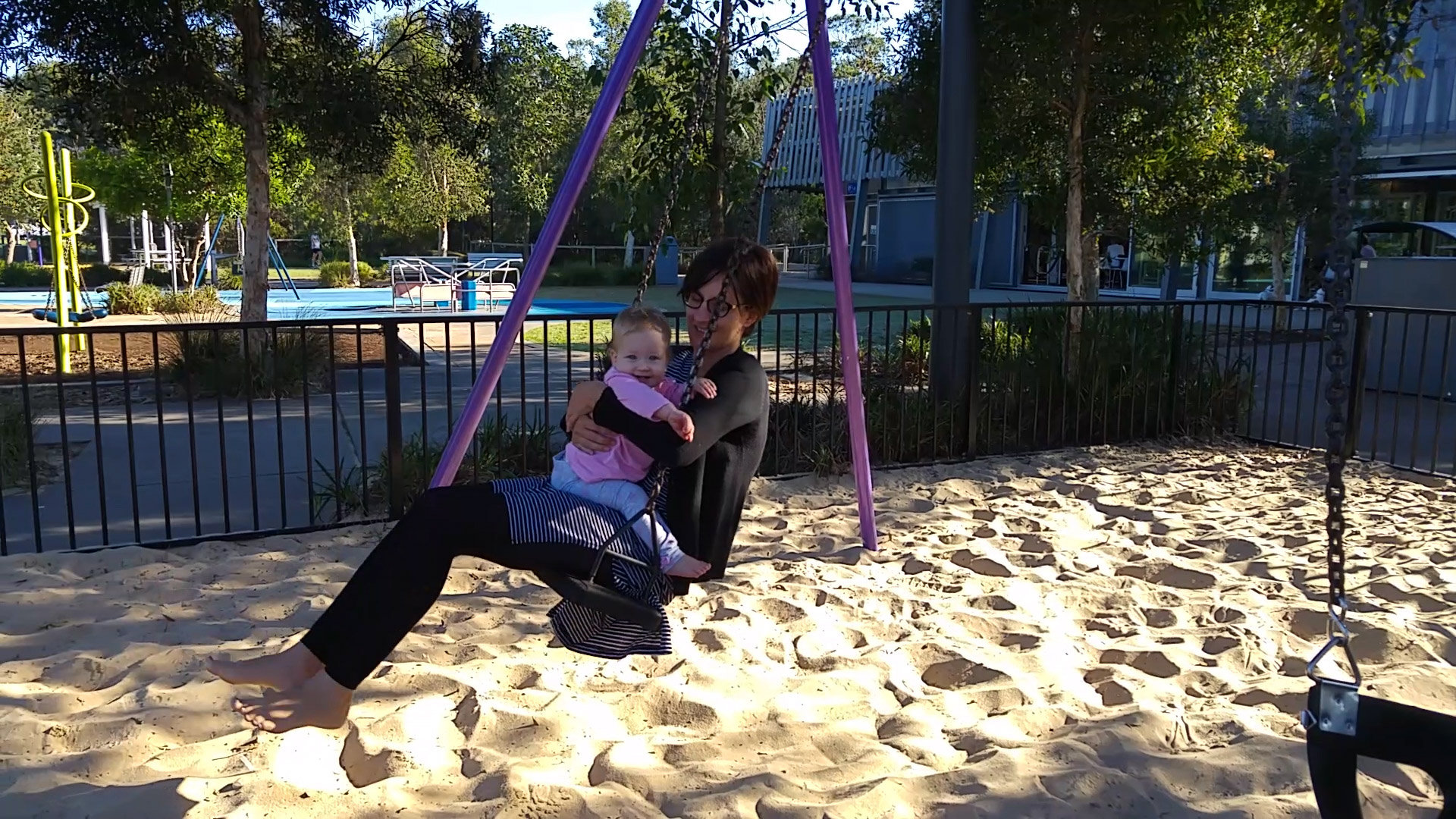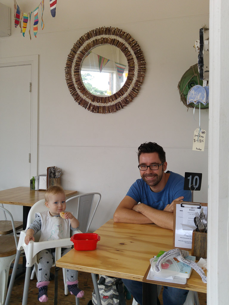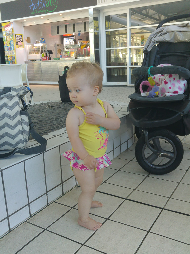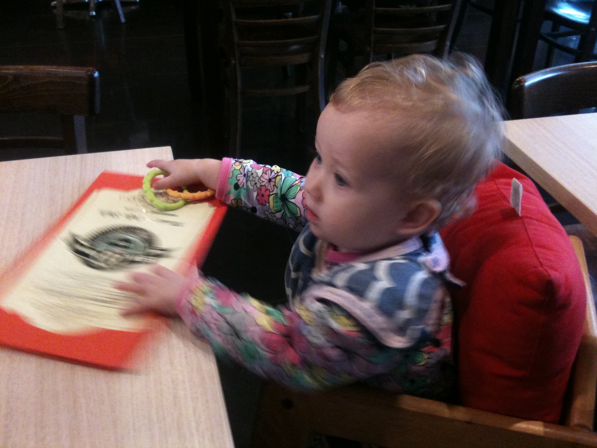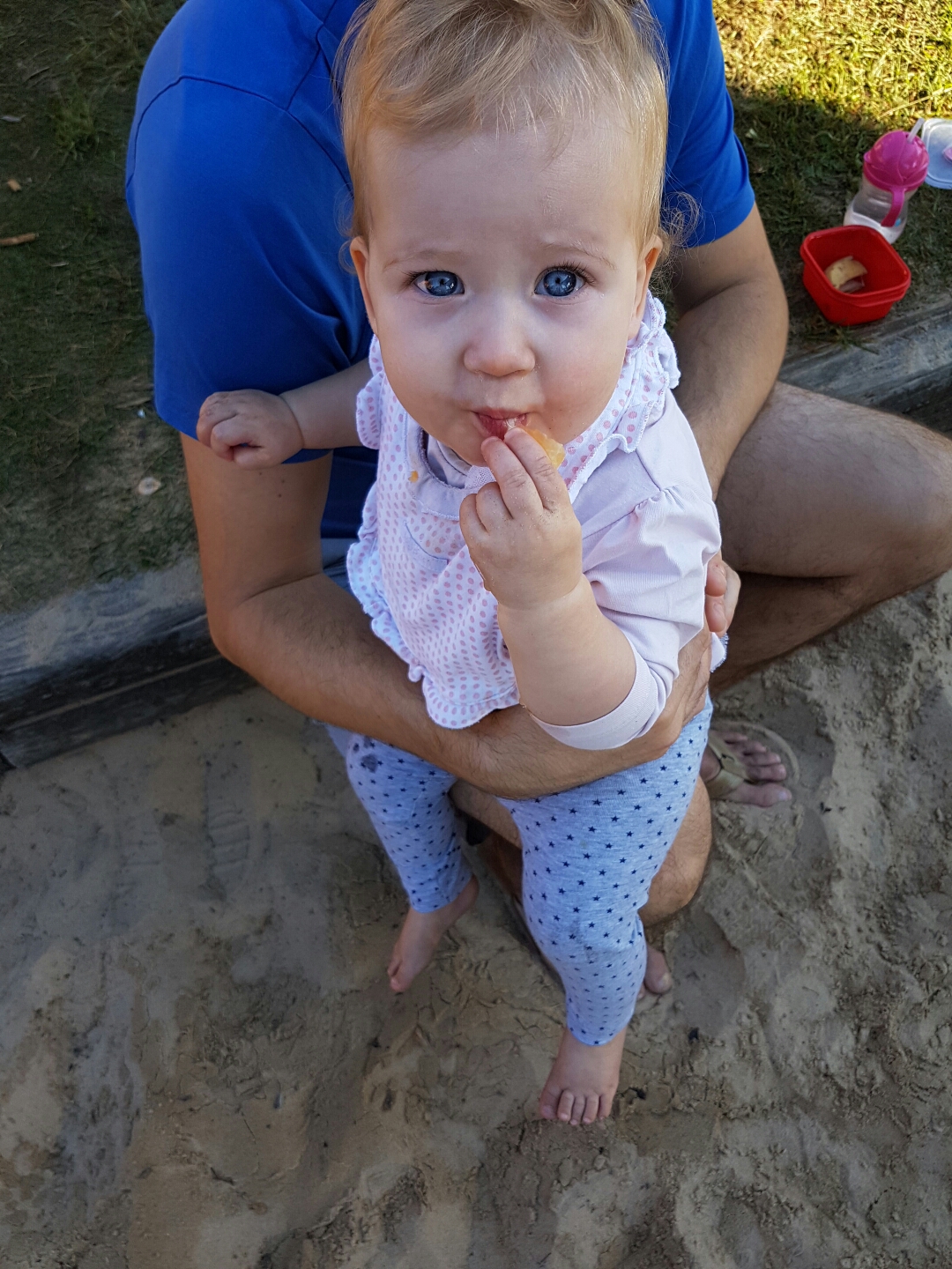 Ze houdt er ook van om naar buiten te gaan. We proberen elke dag ergens naartoe te gaan: de speeltuin, of het strand of als het regent (zelden ;-)) naar een cafeetje. Daar heeft ze voor de eerste keer een vers sapje (watermeloen met appel) mogen drinken, njammie! Mama heeft ook een keertje pannenkoeken gemaakt (zonder eitjes), ook njammie! Ze lust zelfs spruitjes. Maar haar favoriet is denk ik nog steeds pasta 😉