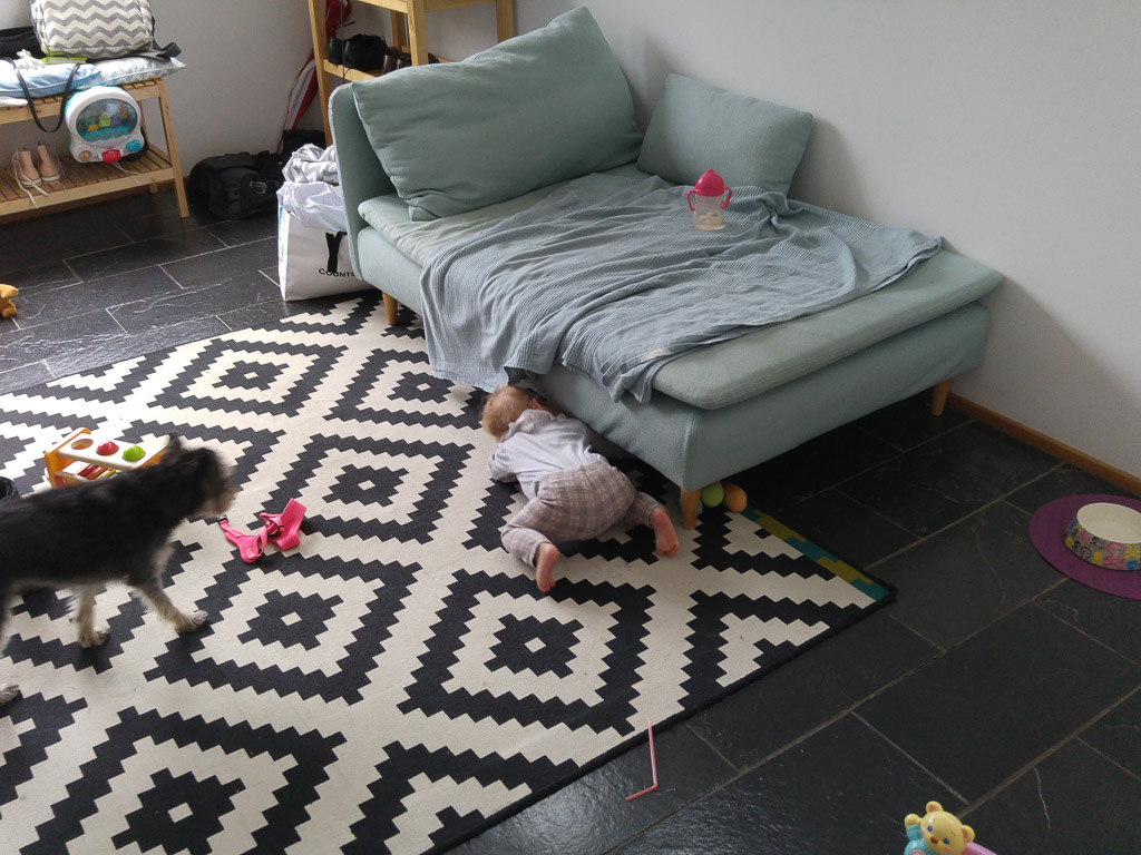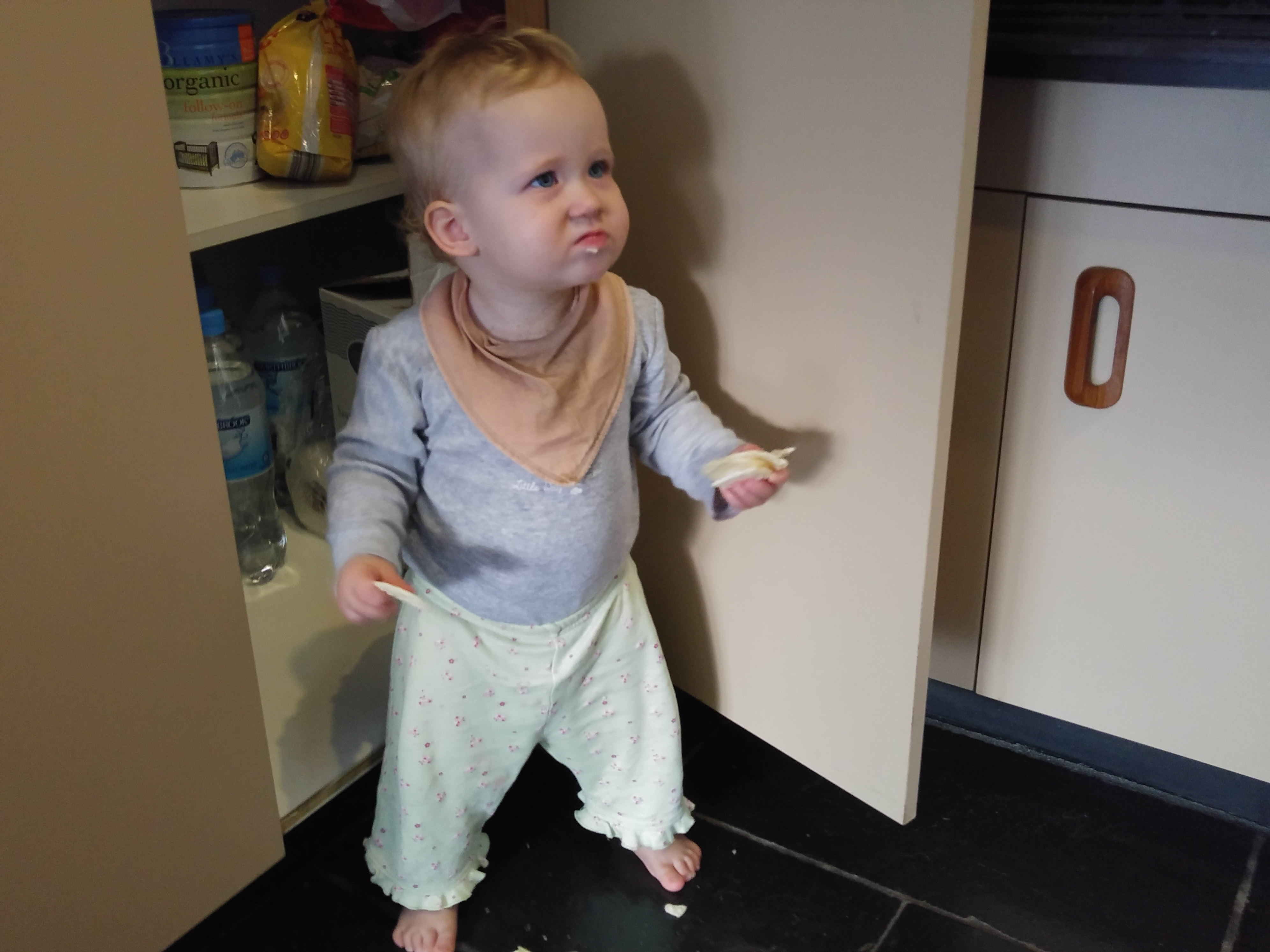 Maar goed, nog een klein overzicht van maand 13. De maand waarin we ontdekten dat ze toch echt wel een allergisch was voor een aantal dingen. We hadden al een aantal keer wat uitslag in het gezicht gezien na in contact te komen met ei. En nu zagen we het ook als Moxie haar lekte. En dan een keer, na het eten van spek (met ei), moest ze overgeven tijdens haar ochtendslaapje erna. Plus begonnen we te vermoeden dat die verschrikkelijk pijnlijke luieruitslag iets met melk-allergie te maken had. Op naar de dokter! En ja hoor ze is allergisch aan ei (medium) en honden-speeksel (licht). Gelukkig niet aan melk, maar de luieruitslag wordt veroorzaakt door een lactose intolerantie. Dus geen koemelk voorlopig. Ook bijna geen yoghurt of kaas meer. Pap is nog wel ok, gemengd met een beetje lactose-vrije melk.