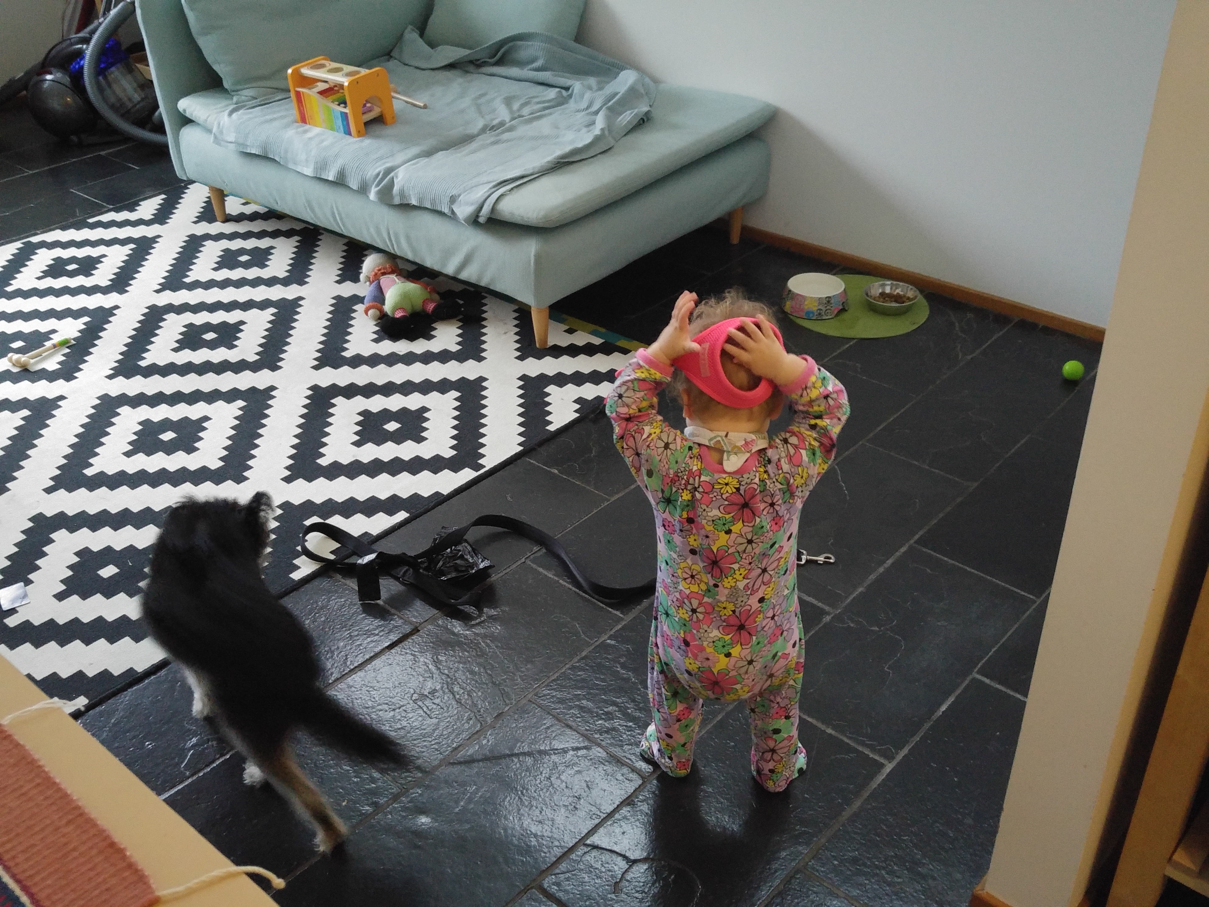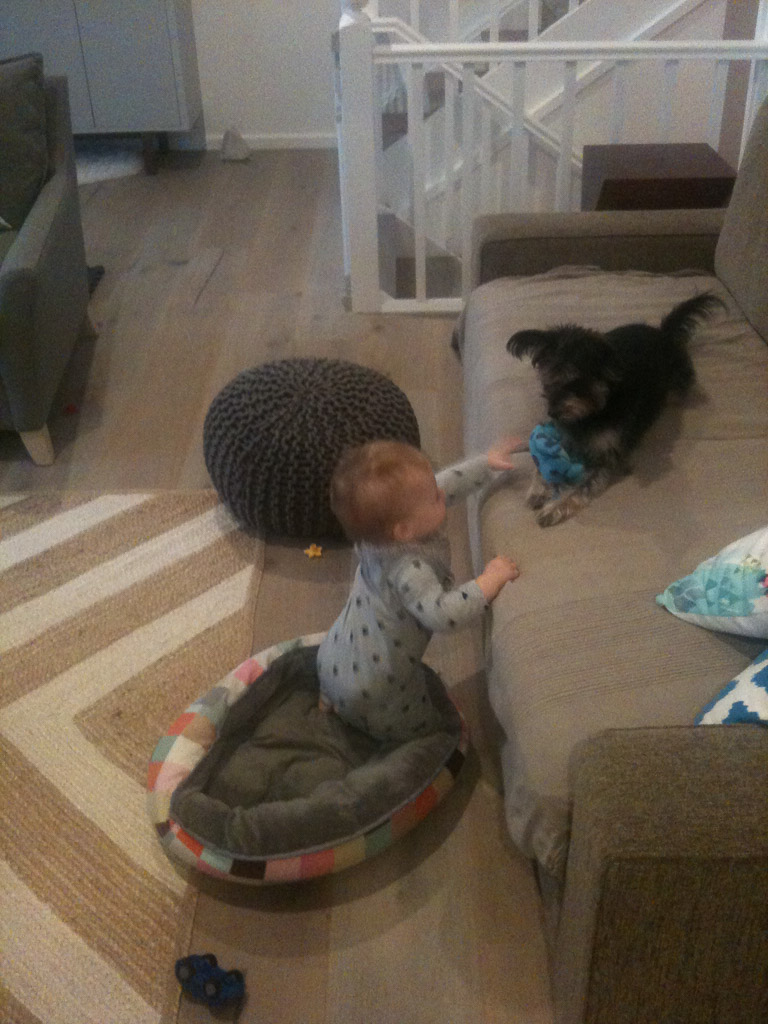 Haar woordenschat begint uit te breiden. Ze zegt ‘brrbrrr’ als ze met het autootje rijdt. ‘Ba’ tegen bal. ‘Mè’ tegen melk. ‘Mamamama’ tegen Moxie. “Mah-mah” en “Pah-pah” tegen mama en papa. Al heten heel veel dingen nog wel mama. Ze zegt ‘da’ als ze iets geeft, bvb als we met Duplo spelen en torens bouwen. Zegt ‘woe’ als we vragen hoe het hondje blaft. Over hondjes gesproken, soms denkt ze dat ze er eentje is!?! Ze kruipt in Moxie’s nestje en gaat daar dan in zitten. Als ze denkt dat we naar buiten gaan gaan, haalt ze Moxie’s leibandje uit de mand. Soms doet ze zelfs het harnas rond haar eigen nek. Ze moppert ook tegen Moxie – rarara waar heeft ze dat geleerd? Oops, mama en papa hebben zich voorgenomen wat liever te zijn voor Moxie. Maar die hond luistert niet…hopelijk pakt moppeke dat niet te hard over?