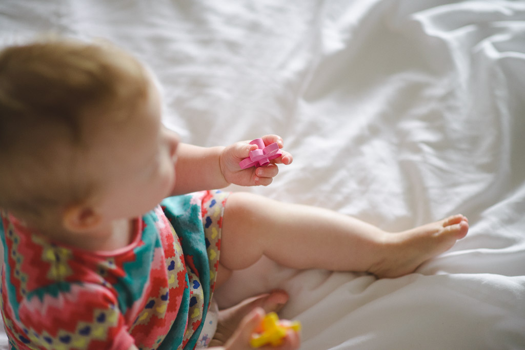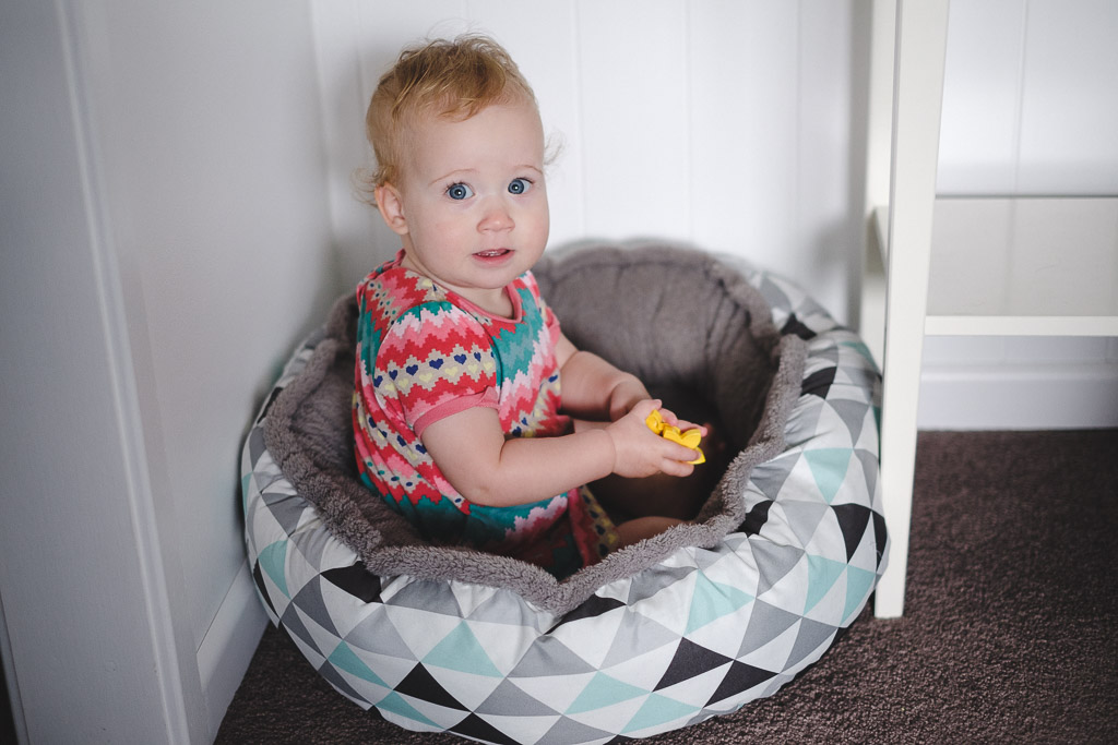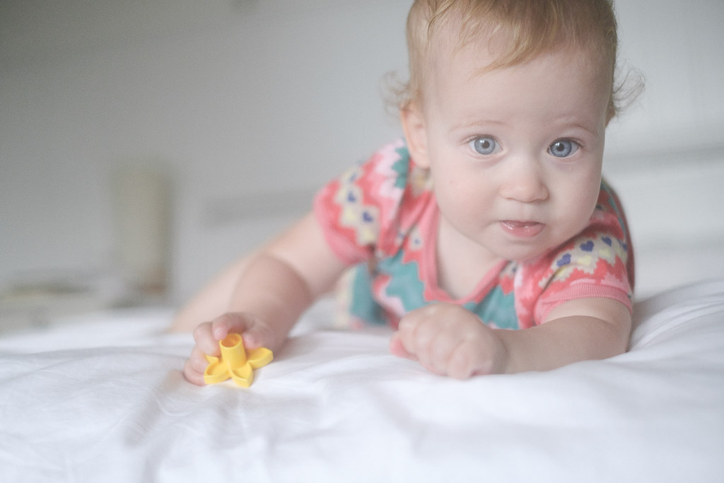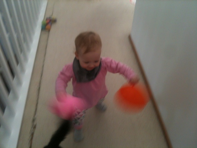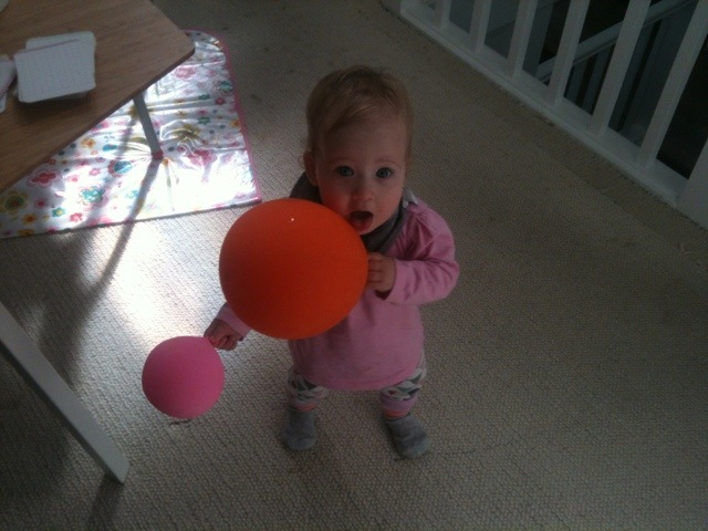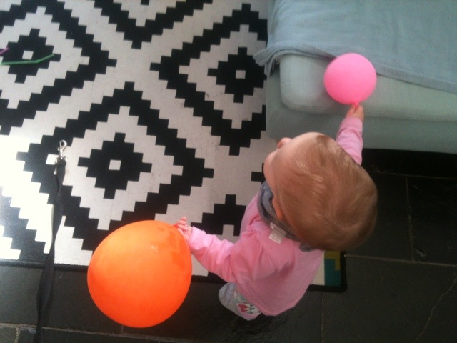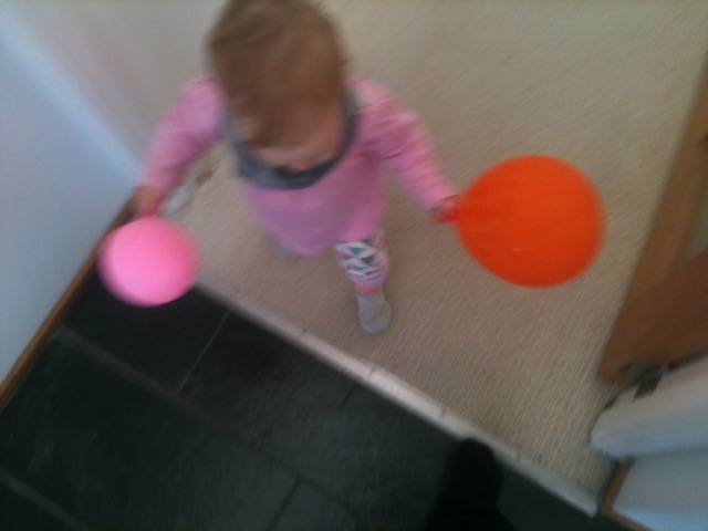 Ze heeft geleerd dat je een ballon het gemakkelijkst bij het tsjoepke kan vastnemen. Dan kan je er in elke hand 1 vasthouden en die super snel heen en weer wiebelen (terwijl je aan 100 k/h door de keuken crosst)