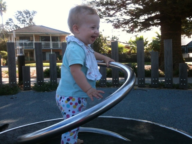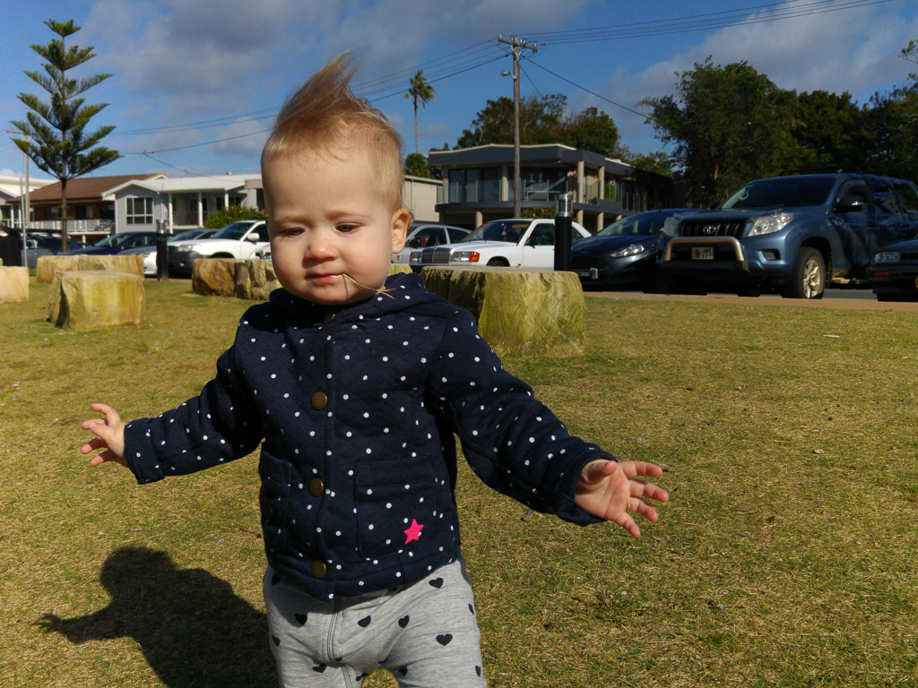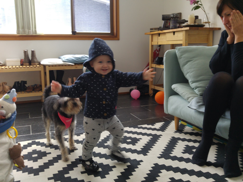 Ze heeft deze maand haar eerste paaseitje achter de kiezen. Haar eerst cake. Haar eerste babycino. We zijn begonnen met melk te geven – maar dit viel samen met teething/nappy rash dus voorlopig maar even gestopt. Ze is hier en daar nog wat ziek geweest – o.a. overgeven à la Exorcist – dus iets minder naar daycare.