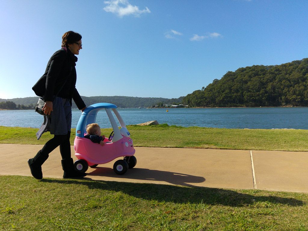 Ondertussen kan ik al heel goed rijden met mijn roze sportkar. Dan ga ik vroemvroem naar de speeltuin. Maar al dat speelgoed is voor kleine kindjes. Ik loop liever zoals de grote kindjes achter de vogels aan! Ik kan al heel snel lopen hoor, niet meer zoals een penguïn van een paar weken geleden.