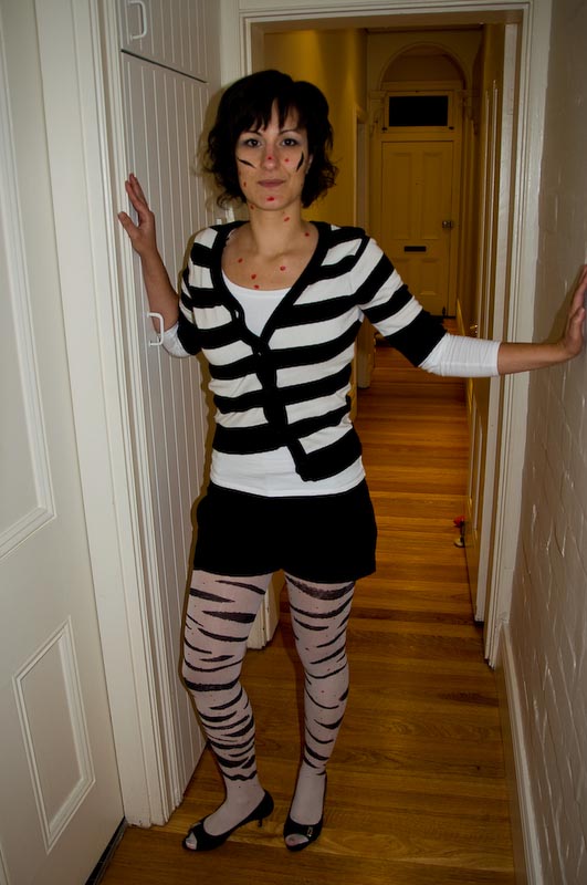 In keeping with the theme ‘black & white and red all over’, I used a pair of white tights which I attacked with black and red waterproof markers.